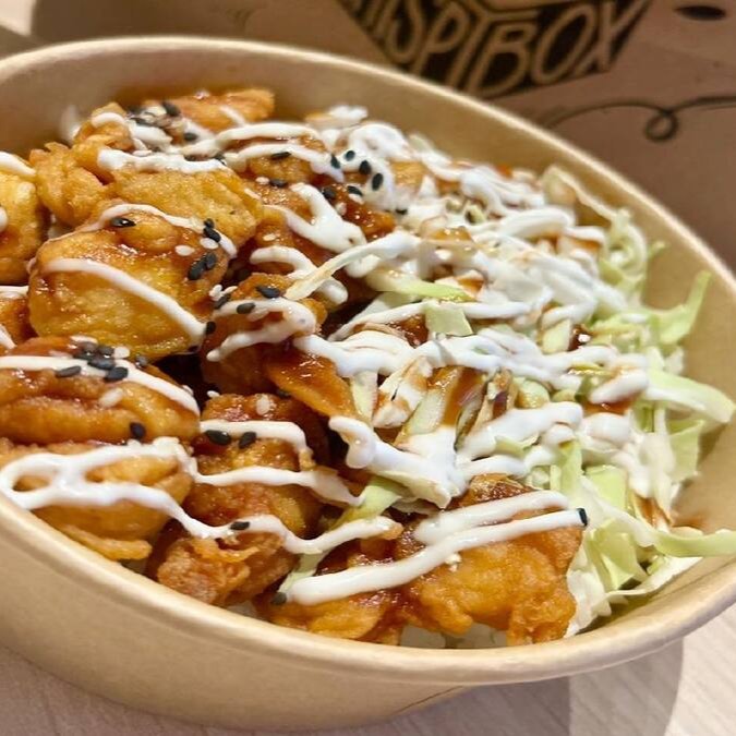 Donburi de Frango Frito - Base de arroz japonês, frango crocante e repolho temperado com molho da casa e maionese. Com nosso molho especial, equilibrado e levemente adocicado.