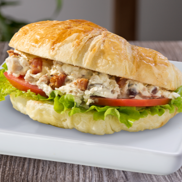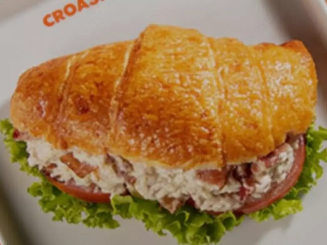 Escolha o tamanho do Croissant (pequeno ou médio), recheado com peito de frango em cubos, cream cheese, bacon, alface e tomate
