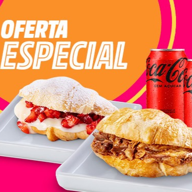 01 Croissant médio, recheado com assado de vazio/fraldinha com cebola, provolone e muçarela + 1 Croissant médio, recheado com Creme de baunilha, morangos e açucar de confeiteiro + 2 Refri lata do seu sabor preferido