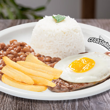 Contra filé (150g in natura) com ovo frito (gema dura) com os acompanhamentos de arroz branco, feijão e fritas ou purê de batatas.