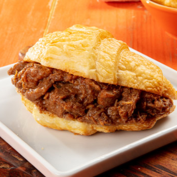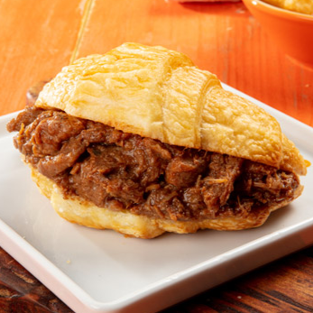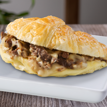 Escolha o tamanho do Croissant (pequeno ou médio), recheado com assado de vazio/fraldinha com cebola, provolone e muçarela