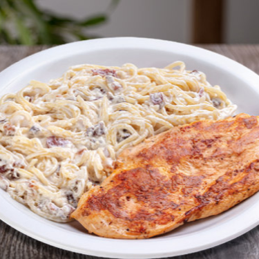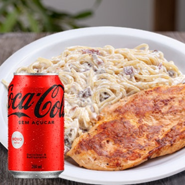 Filé de frango grelhado com 150g de spaguetti grano duro, creme de leite, parmesão e bacon + 01 Refrigerante Lata