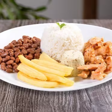 Iscas de frango (120g in natura) com os acompanhamentos de arroz branco, feijão, fritas ou purê de batatas e farofa.