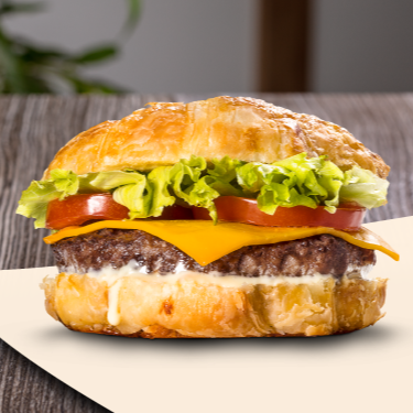 Croissant tamanho M com hambúrguer de carne bovino, queijo cheddar, alface americana, tomate e molho parmesão + batata chips