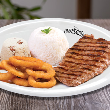 Bife argentino (220g in natura), com os acompanhamentos de arroz branco, anéis de cebola empanados e farofa.