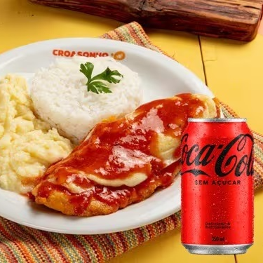 Parmegiana feito com filé de frango empanado com molho de tomate e muçarela, arroz branco, batata palha ou purê + 01 Coca-Cola lata 350ml Grátis