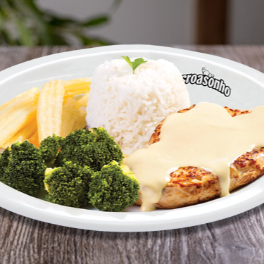 Filé de frango (250g in natura) ao molho honey & mustard (mel e mostarda), com os acompanhamentos de arroz branco, fritas ou purê de batatas e brócolis.