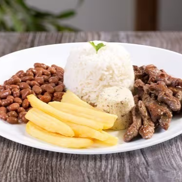 Iscas de carne bovina (120g in natura) com acompanhamentos de arroz branco, feijão, fritas ou purê de batatas e farofa.