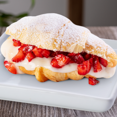 Croissat de tamanho Pequeno, recheado com Creme de baunilha, morangos e açucar de confeiteiro