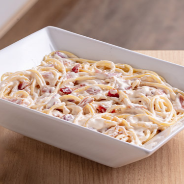 Spaghetti grano duro, creme de leite, parmesão e bacon.