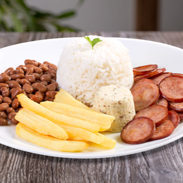 Calabresa fatiada (120g in natura) com acompanhamentos de arroz branco, feijão e fritas ou purê de batatas.