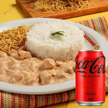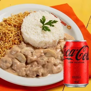 Strogonoff feito com cubos de frango, creme de leite, champignon, ketchup, mostarda, batata palha e arroz branco + 1 Refrigerante Lata