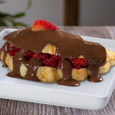Escolha o tamanho do Croissant (pequeno ou médio), recheado com chocolate ao leite Nestlé e morangos