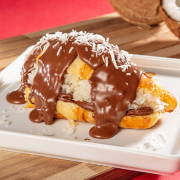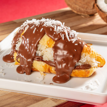 Escolha o tamanho do Croissant (pequeno ou médio), recheado com Coco e leite condensado coberto com Chocolate ao Leite Nestlé e coco ralado.