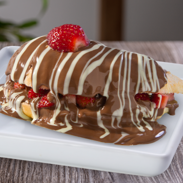 Escolha o tamanho do Croissant (pequeno ou médio), recheado com Chocolate ao leite Nestlé com morangos e um toque de chocolate branco