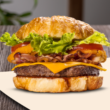 Croissant tamanho M com hambúrguer de carne bovino, bacon, queijo cheddar, anéis de cebola, molho barbecue, alface americana e tomate + batata chips