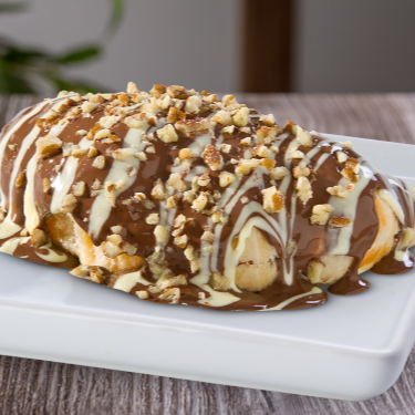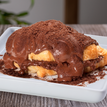 Escolha o tamanho do Croissant (pequeno ou médio), recheado com Chocolate ao leite Nestlé com um toque de chocolate branco e coberto com nozes