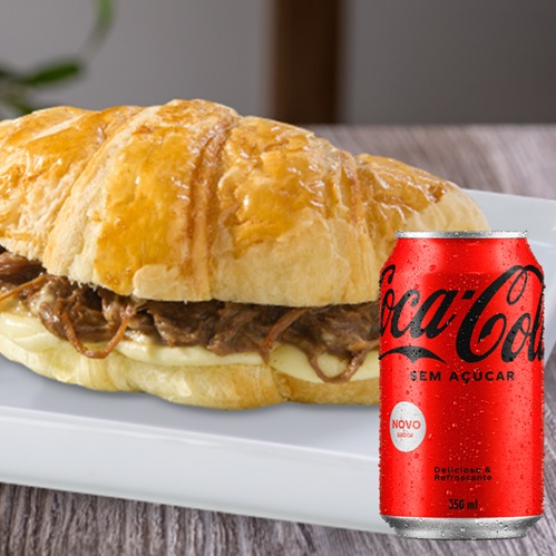 Escolha o tamanho do Croissant (tamanho Médio), recheado com carne de panela desfiada e queijo muçarela + 1 Refrigerante Lata do seu sabor favorito