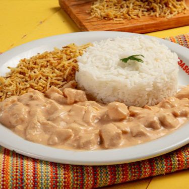 Strogonoff feito com cubos de frango, creme de leite, champignon, ketchup, mostarda, batata palha ou purê e arroz branco.
