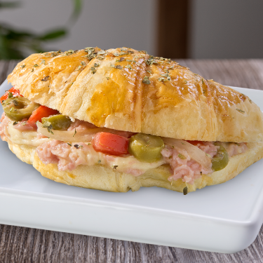Croissant tamanho Médio recheado com presunto, queijo muçarela, cebola, tomate, azeitona e orégano