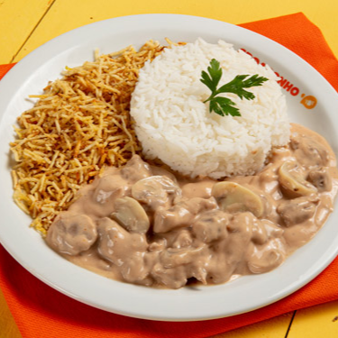 Strogonoff de carne feito com cubos de carne bovina, creme de leite, champignon, ketchup, mostard, batata palha ou purê e arroz branco.