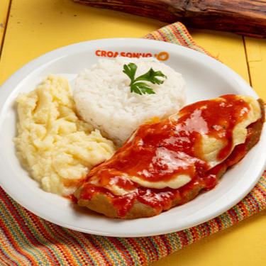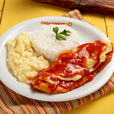 Parmegiana feito com filé de frango empanado com molho de tomate e muçarela, arroz branco, batata palha ou purê.