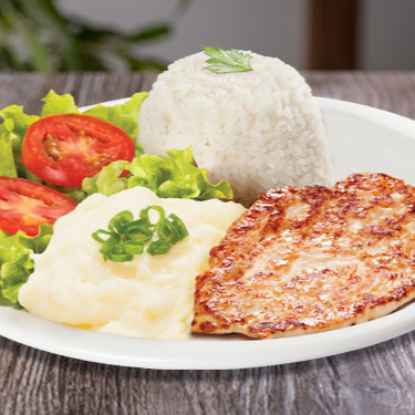 Filé de Frango (135g in natura), com acompanhamentos de arroz branco, fritas ou purê de batatas e salada de alface com tomate.