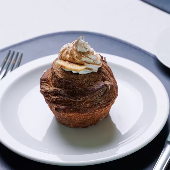 Depois, chega o momento de entregar-se à indulgência: o Croissant Creme Brûlée, com seu topo caramelizado que estala levemente ao toque da colher, revelando um creme sedoso que perfuma o ar com baunilha real. É contraste, brilho, textura — tudo o que faz o doce perfeito.