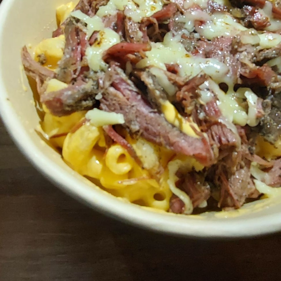 O famoso prato americano, com cobertura de queijo provolone e brisket. O suave e o picante juntinhos! Nosso macarrão com queijo em porção de 400 gramas, servido com 80 gramas de brisket (peito bovino defumado e levemente picante) e finalizado com provolone.