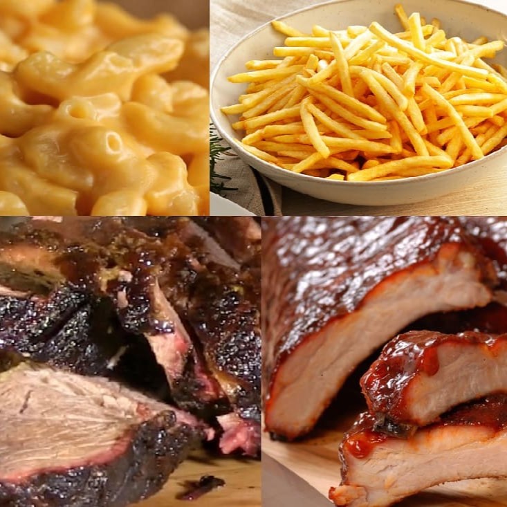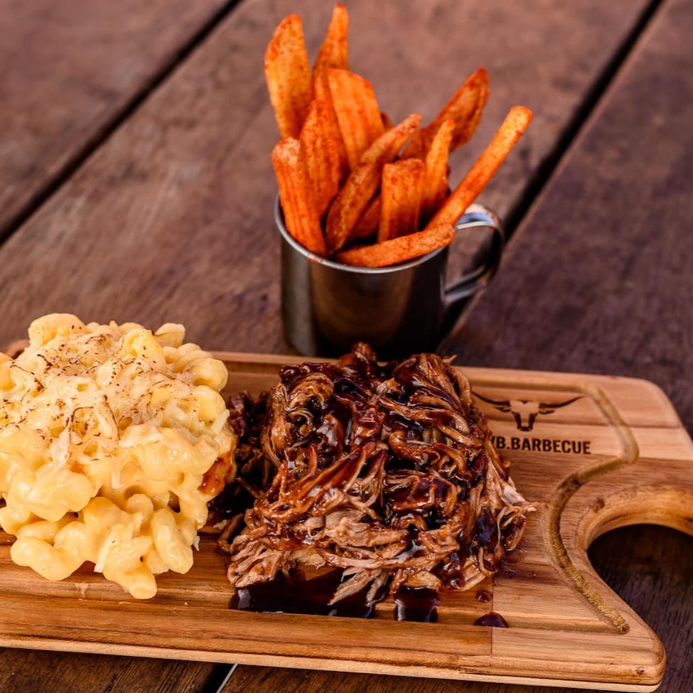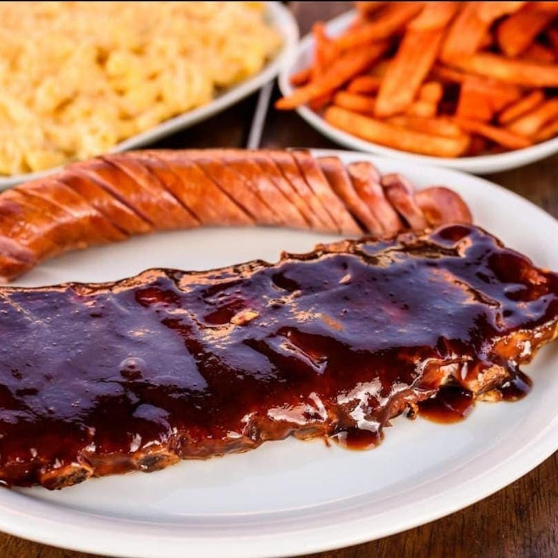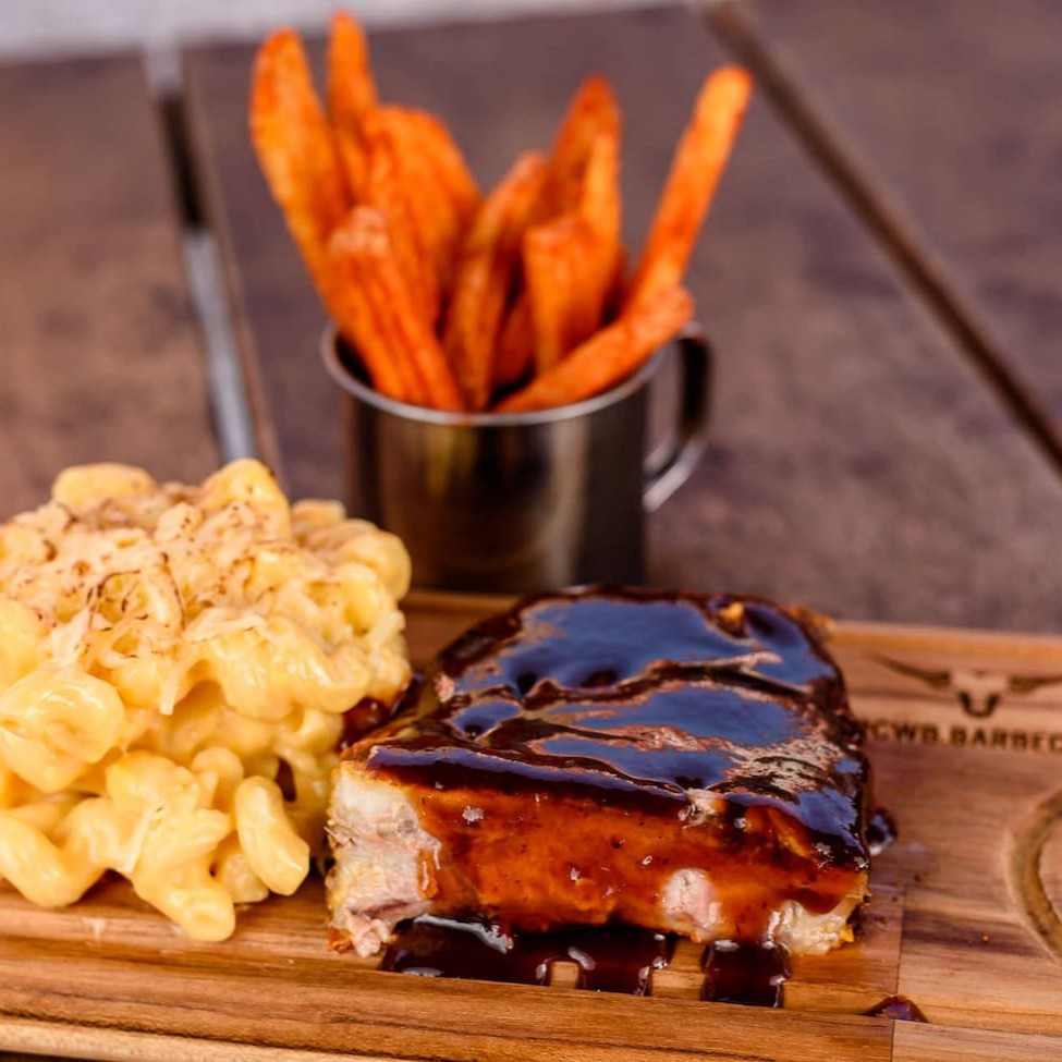 Deliciosa porção da melhor costelinha barbecue, assada e defumada por 06 horas, 1 porção de linguiça + 1 porção grande de mac and cheese e 1 porção grande de batata frita com tempero da casa.