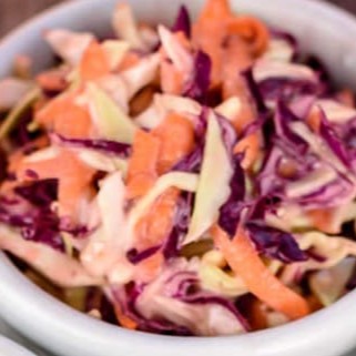 Salada de repolho e cenoura preparada com maionese e vinagre de maça,sua acidez combina perfeitamente com o barbecue
