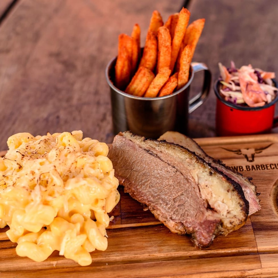 A melhor carne do churrasco defumado, com deliciosos acompanhamentos! Brisket (150g), mac'n cheese (200g), batata frita (100g) e coleslaw (50g). obs: substituições não são possíveis.