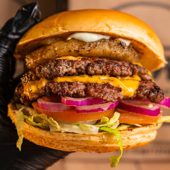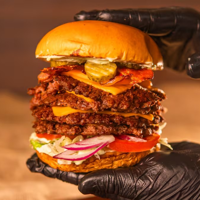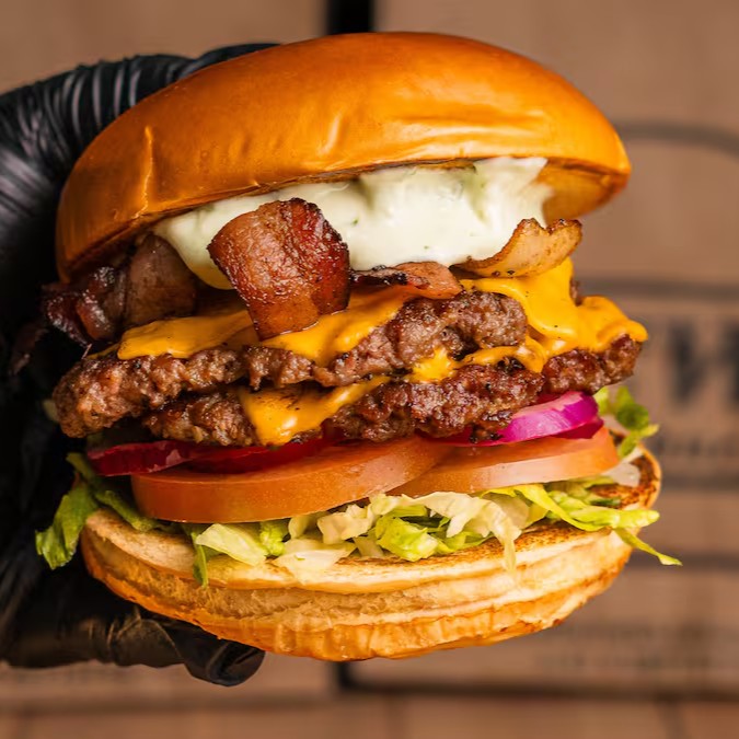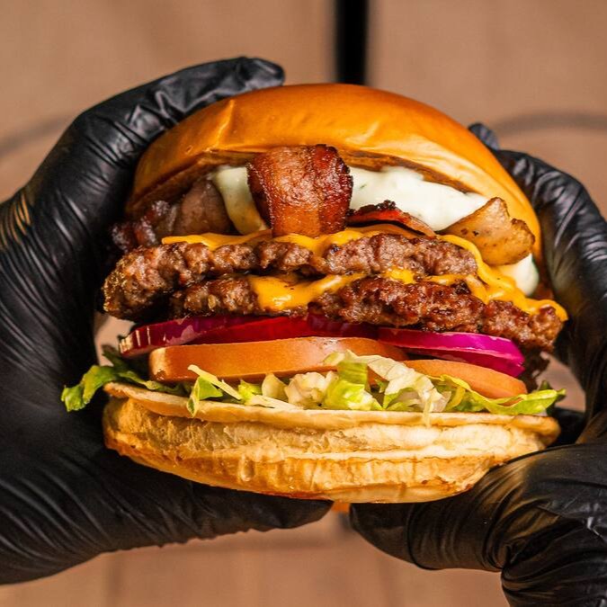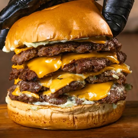 Pão brioche macio, maionese cremosa, quatro hambúrgueres smash de 90g (in natura), quatro fatias de cheddar, bacon fatiado, cheddar cremoso, alface, tomate, cebola roxa e picles