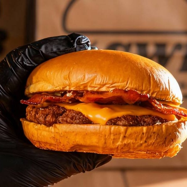 Pão brioche, maionese cremosa, um hambúrguer smash de 90g, uma fatia de queijo cheddar e bacon