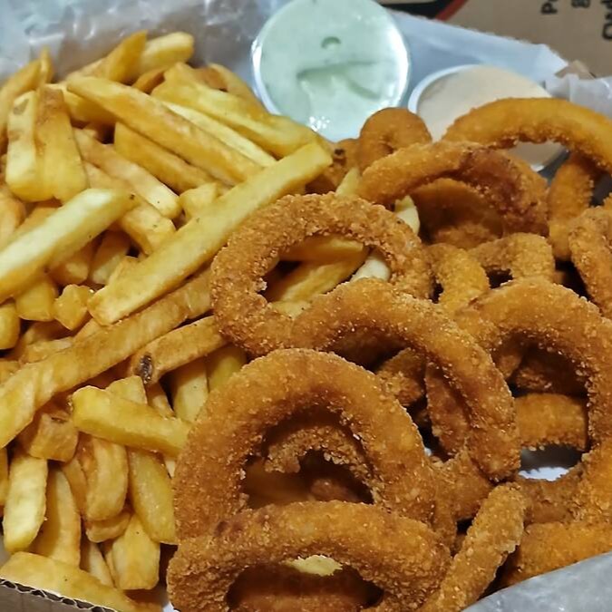 Pão brioche , maionese cremosa, dois hambúrguer smash de 90g (in natura), 2 fatias de queijo cheddar, molho barbecue e 3 onion rings