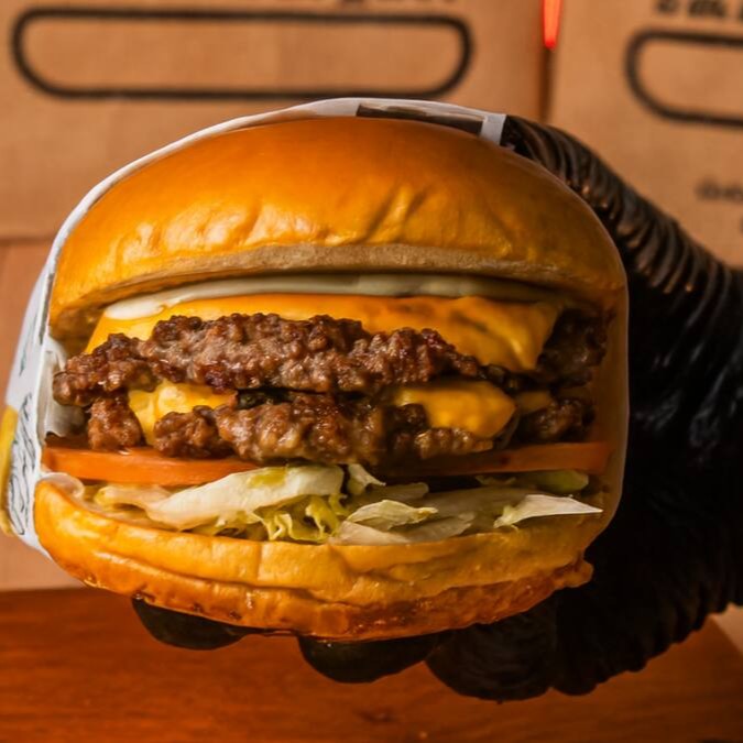 Pão brioche, maionese cremosa, dois hambúrguer smash de 90g (in natura) , queijo cheddar derretido, alface e tomate