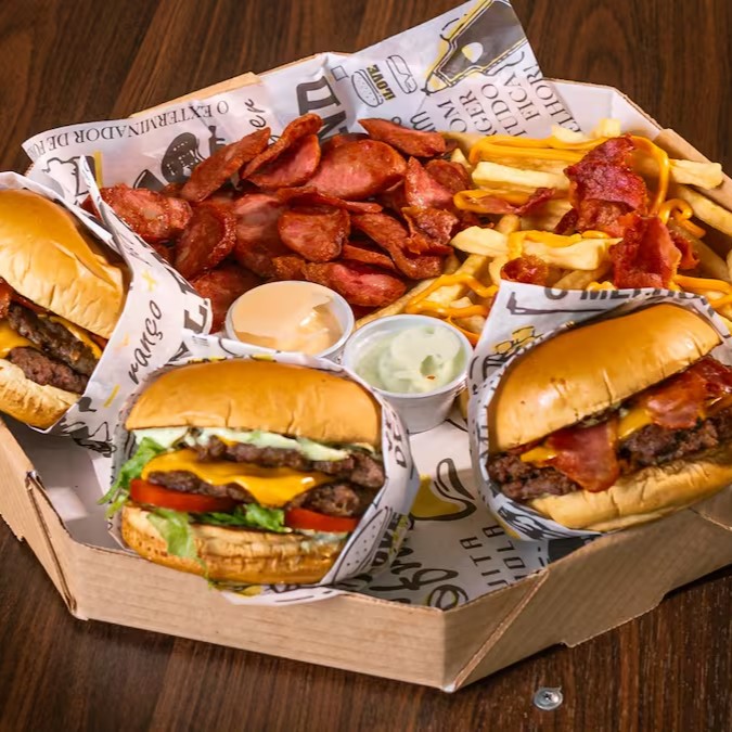 Monte seu combo escolhendo seus tres lanches favoritos, acompanha uma porção de batata frita com bacon e cheddar e uma porção de calabresa