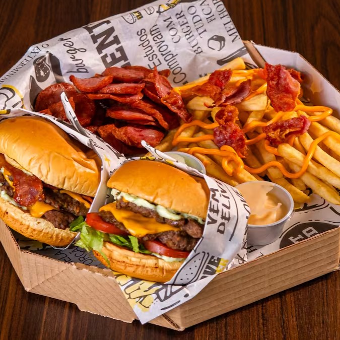 Monte seu combo escolhendo seus dois lanches favoritos, acompanha uma porção de batata frita com bacon e cheddar e uma porção de calabresa e dois molhos cortesia disponíveis no momento