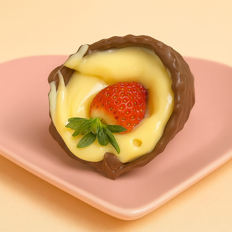 Cascão banhado em chocolate recheado com brigadeiro belga branco e pedaços de brownie e morango