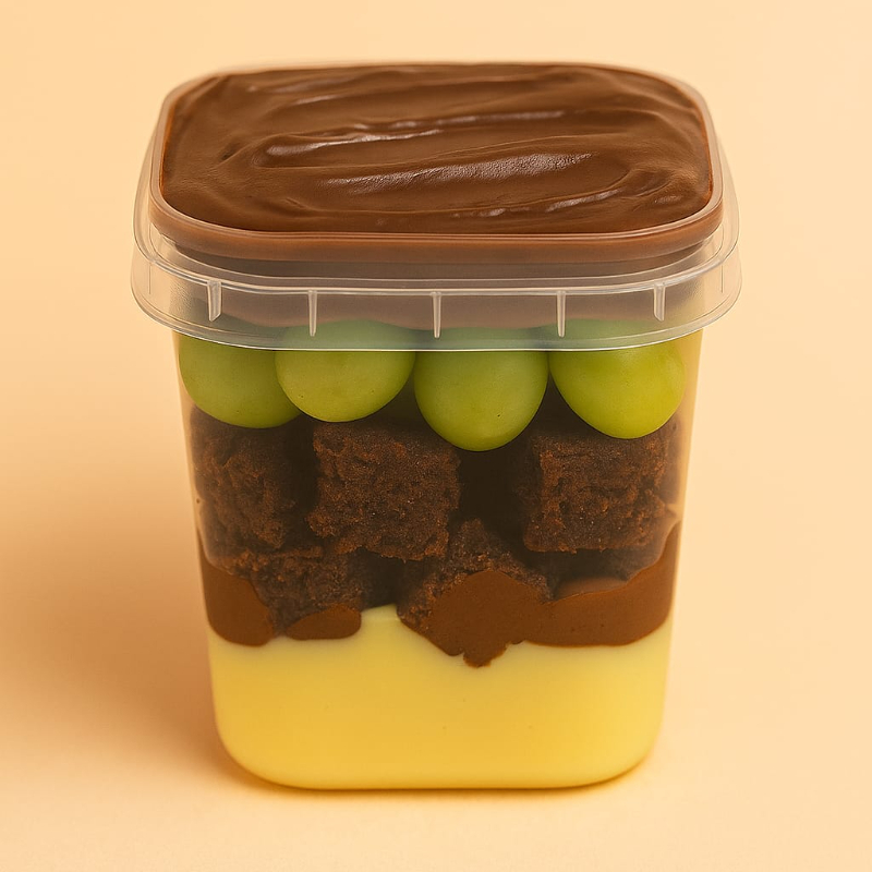 brigadeiro branco cremoso, pedaços de brownie, uvas sem sementes e brigadeiro belga preto cremoso. Pote de 220g