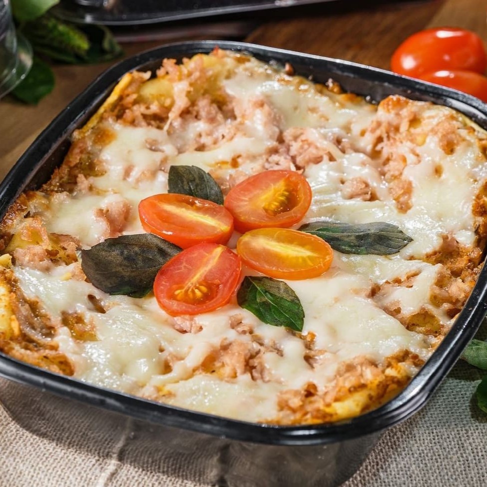 Lasanha congelada e artesanal, feita com massa fresca e fininha, camadas de molho bechamel cremoso e recheio saboroso de carne e presunto moído. Acompanha queijo para gratinar, tomate e manjericão de decoração. A bandeja é forneável e pode ir direto ao forno ou micro-ondas, garantindo praticidade sem perder o sabor caseiro. Produto congelado para manter frescor e qualidade excepcionais. Ideal para quem busca lasanha artesanal congelada com sabor caseiro e qualidade premium. Foto real do produto.