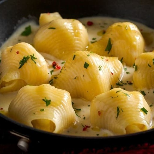 Conchiglioni (conchiglione) artesanal, recheado com uma combinação generosa de quatro queijos. Recheio cremoso e cheio de personalidade, preservando todo o sabor caseiro. Produto congelado para manter frescor e qualidade. Não acompanha molho, mas combina perfeitamente com o clássico molho pomodoro ou o cremoso molho rosê. Prepare em casa ou escolha seu molho favorito para uma refeição prática e deliciosa.