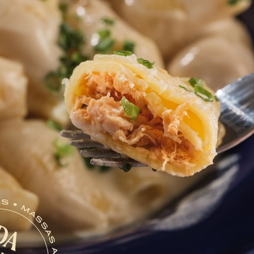 Conchiglioni (conchiglione) artesanal, com recheio generoso de frango desfiado e requeijão cremoso. Recheio cremoso e irresistível, preservando todo o sabor caseiro. Produto congelado para manter frescor e qualidade. Não acompanha molho, mas combina perfeitamente com o cremoso molho 4 queijos ou o suave molho rosê. Prepare em casa ou escolha seu molho favorito para uma refeição prática e deliciosa. Sabor delicado, ideal também para o paladar das crianças.