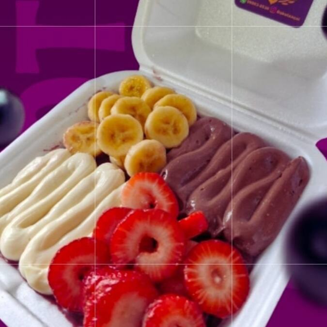 Delicioso açaí batido com banana ,morango, leite Ninho e leite condensado.