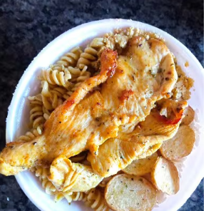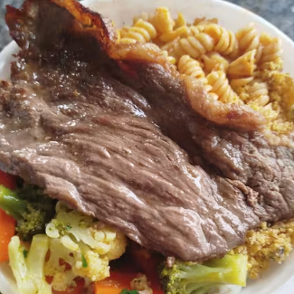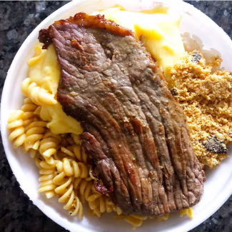Acompanha arroz, feijão, farofa e macarrão! Dependendo do dia pode ir mais algum acompanhamento!