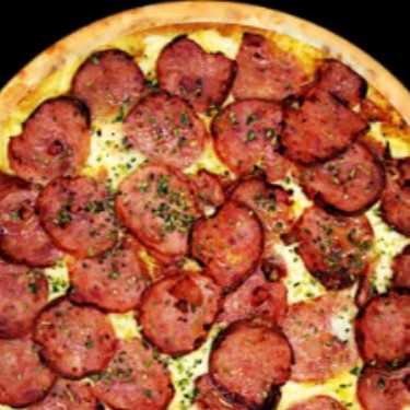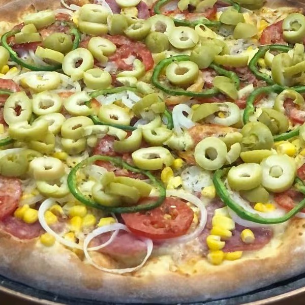 Mussarela, milho verde, calabresa, bacon, Catupiry e palmito