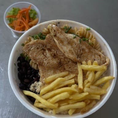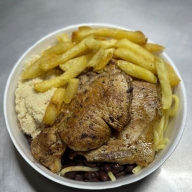 Arroz, feijão preto, macarrão, farofa com bacon, peito de frango, batata frita e salada separada (opcional).