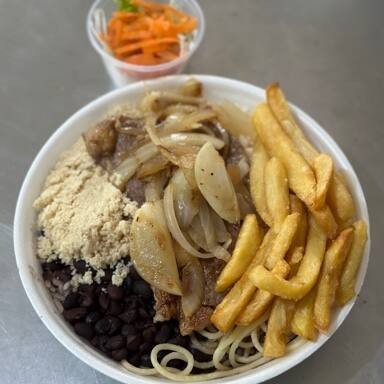 Arroz, feijão preto, macarrão, farofa com bacon (opcional), três ovos fritos, batata frita e salada separada (opcional).