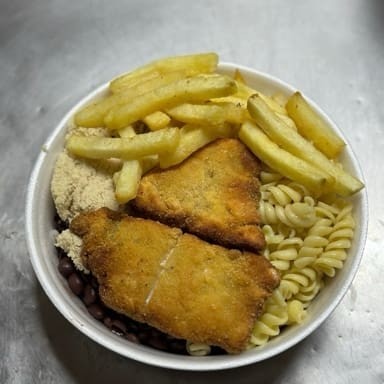 Arroz, feijão preto, macarrão, farofa com bacon, peixe à milanesa, batata frita e salada separada (opcional).