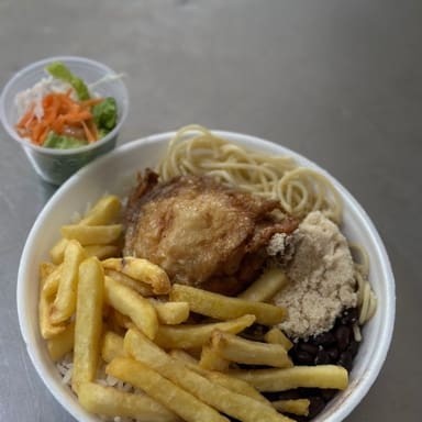 Arroz, feijão preto, macarrão, farofa com bacon, batata frita, frango frito e salada separada (opcional).